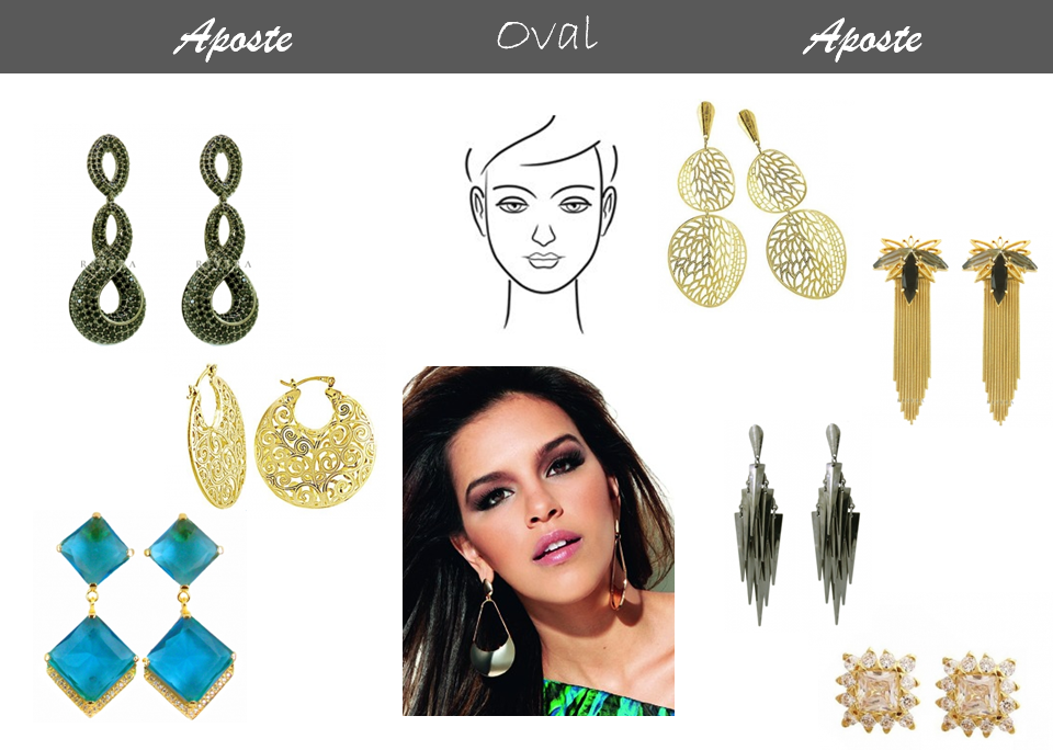 Com este tipo de rosto, não aconselhamos você usar brincos do tipo muito grande. Você tem que observar e se guiar sempre pelo tamanho do seu rosto. Caso fique desproporcional, tente outro do mesmo formato, porém menor. Em relação ao formato você tem sorte, pois seu rosto combina com quase todos os formatos de brincos. Veja os exemplos na foto acima.