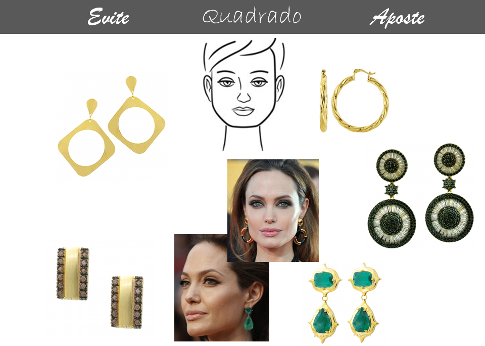 Com este tipo de rosto, não aconselhamos você usar brincos tipo fios e/ou compridos. Para que você ganhe mais equilíbrio neste formato de rosto, você deve apostar em brincos com que se destacam pelas laterais e menores no tamanho. Veja os exemplos na foto acima.