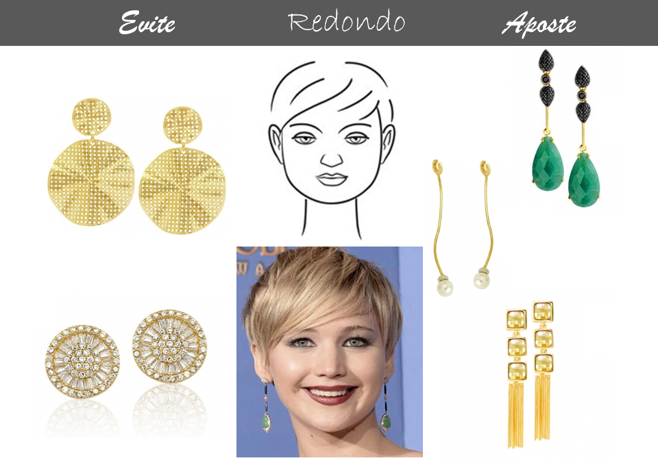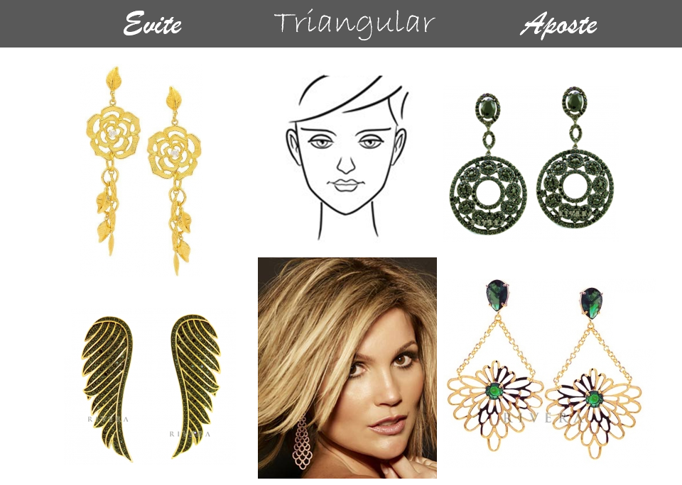 Com este tipo de rosto, não aconselhamos você usar brincos que lembram formas geométricas. Por exemplo: triângulos, quadrados e retângulos. Estes formatos competem com seu tipo de rosto. Use e abuse dos tipos argolas, gotas e ovais. Fora isso, você também é privilegiada, pois seu rosto combina com muitos formatos de brincos. Veja os exemplos na foto acima.